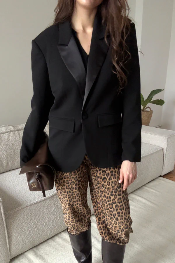 Marynarka ALBERTA to klasyczna i ponadczasowa propozycja, która nigdy nie wyjdzie z mody. Prosta, czarna marynarka, została wzbogacona w satynowy kołnierz. Posiada szerokie ramiona. Zapinana na powlekany guzik, szyta na wiskozowej podszewce.