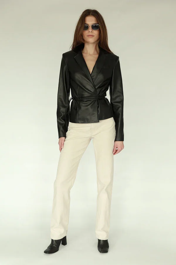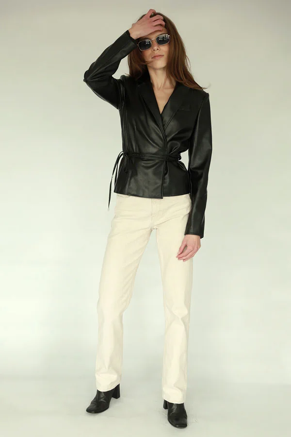 Marynarka LIV to oryginalna, ale jak większość naszych wzorów, również ponadczasowa propozycja. Wykonana w całości ze skóry ekologicznej ożywi i urozmaici nawet najprostszą stylizację. Marynarka LIV wyróżnia się szeroką linią ramion, połyskującą czernią ekoskóry i oryginalnym zapięciem w postaci sznurka.