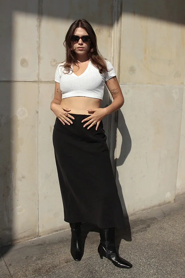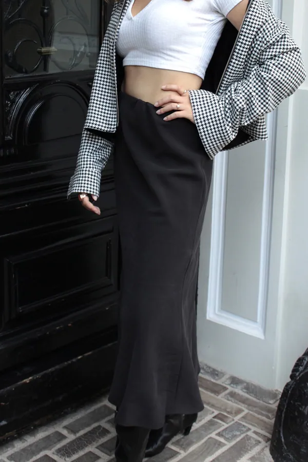 Klasyczna, czarna spódnica midi, szyta ze skosu, dzięki czemu ten model idealnie układa się do każdej sylwetki.
