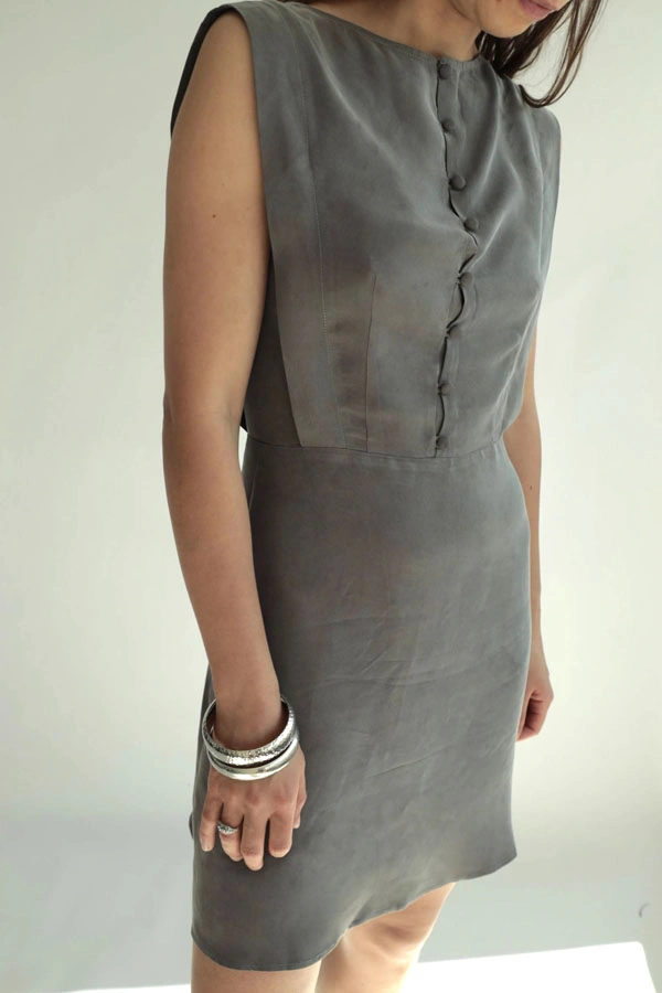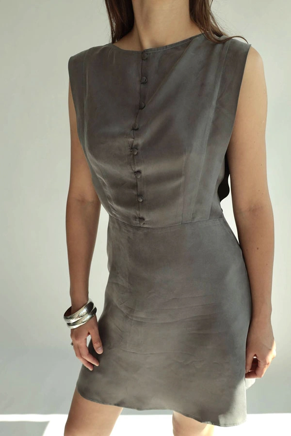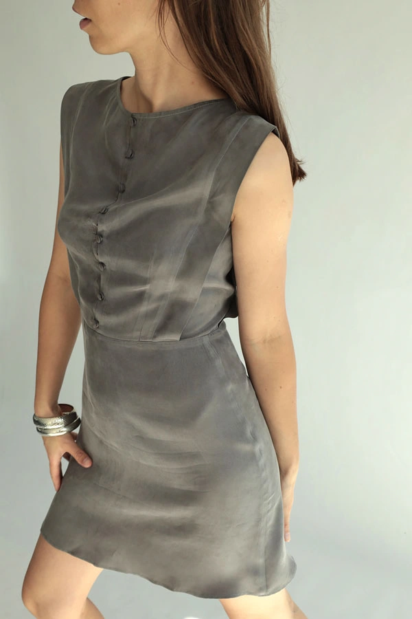 Sukienka TESSA w przepięknym, srebrzystym kolorze to unikalność i funkcjonalność w jednym. Sukienka TESSA zapinana jest na powlekane guziczki. Wzór charakteryzuje się wyjątkową konstrukcją, a dodatkowe cięcia, zaznaczają i podkreślają linie ramion. Sukienka TESSA ma charakter dopasowany typu mini i wykonana jest ze szlachetnej tkaniny, kombinacji cupro i jedwabiu.