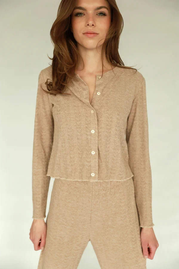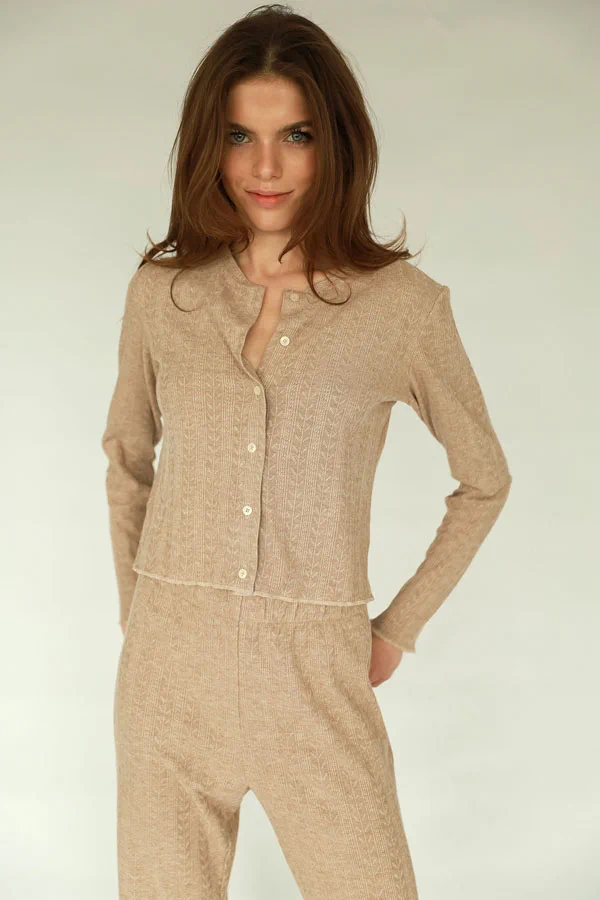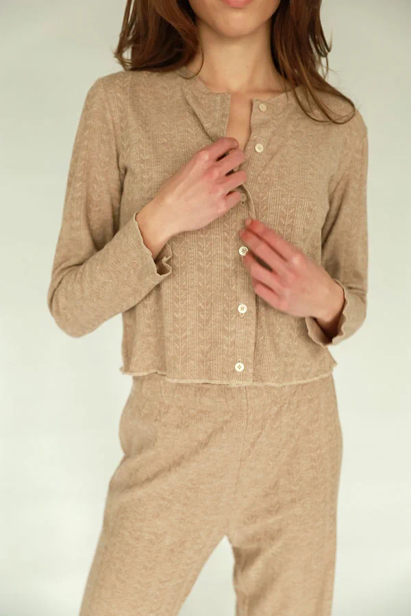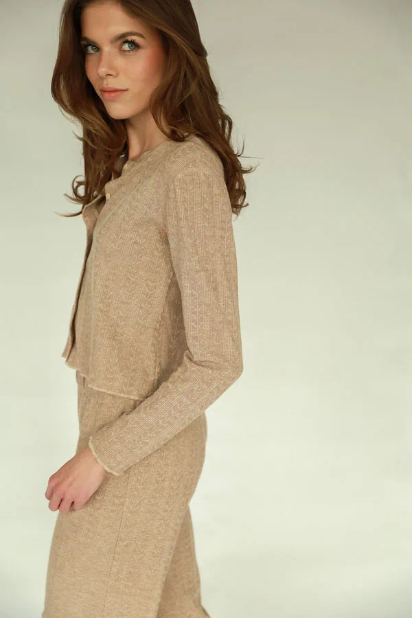 Przepiękny, lekki kardigan LOU w kolorach kremowym i modnym w tym sezonie „cynamonowym” – idealny na letnie dni i wieczory. Połącz np. ze spodniami LOU lub CHARLIE.